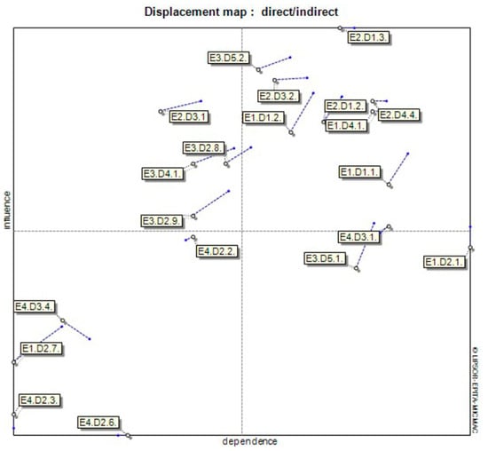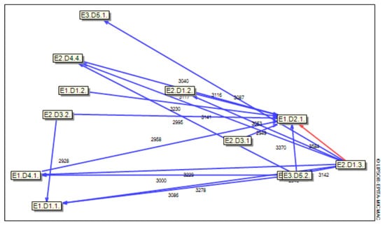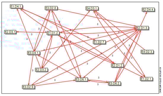 Through the analysis of the direct influence of the identified variables, the variable E2.D1.3 has a strong influence on most of the variables. The indirect influence reveals a strong influence from E2.D1.3 to E1.D2.1.