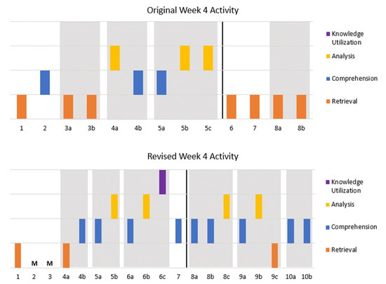Marzano question level coding for the original and revised Week 4 activities. The black line indicated where the reflection is placed and the questions to the right are in the continuing on section. M indicates a metacognition question. Gray boxes are used to highlight when questions are scaffolding for students to answer with parts a, b, c, etc.