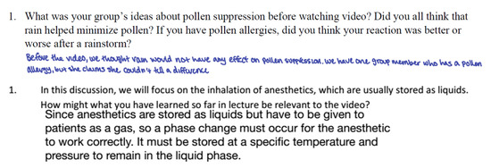 When students were asked metacognitive questions such as “How might what you have learned so far in the lecture be relevant to the video?” or “What were your group’s ideas about pollen suppression before watching the video?” they were able to make connections with previous knowledge. Example written responses can be seen in Figure 2.