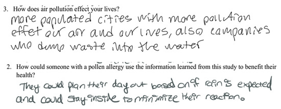 Additionally, some questions asked students to consider environmental issues and sometimes offer advice such as: “How does air pollution affect your lives?” and “How could someone with a pollen allergy use the information learned from this study to benefit their health?”. When questions of this type were asked, students were able to bring in outside, previous knowledge, and offer a variety of observations and advice. Examples of student group written responses can be seen in Figure 3.