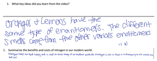 However, some questions did not ask students to think about previous knowledge and only asked them to summarize the video directly, such as: “What key ideas did you learn from the video?” and “Summarize the benefits and costs of nitrogen in our modern world”. When these types of questions were asked, students responded only as asked and did not incorporate information from outside of the video. Example written responses can be seen in Figure 4.
