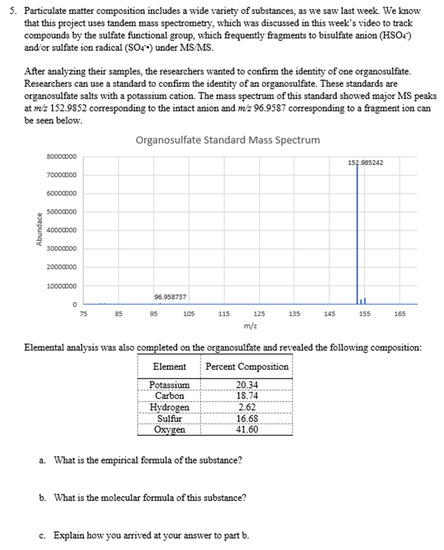 Contextual information was provided for all problems, describing where data came from and the importance of the studies to situate students before solving problems. Although students were able to make connections when prompted, their interactions revealed that overall, students were dismissive of the pre-class activity and the contextual information. This was seen whether or not the activities incorporated research data. As an example, across weeks five and seven, students were asked to propose structures for compounds from data. In Week 5, a revised activity was used that focused on identifying compounds in particulate matter. One question asked on the activity can be seen in Figure 5. This question gave the students mass spectrometry and elemental analysis data and asked students to identify the formula and explain how they reached their answer. The additional context was given about why the researchers would want to identify the substance in particulate matter and the method they would use to complete the analysis.