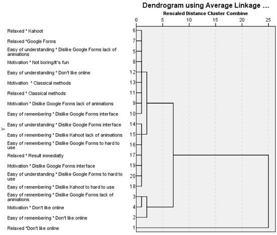 We notice that the greatest impact on students’ psychological processes occurs due to technological factors [41], so the characteristics of the tools, such as the interface, the way of use, and animations, have an extrinsic impact on them. The ease of remembering has recorded 6 associations with: I don’t like Google Forms interface, I don’t like Google Forms it’s too hard to use, I don’t like Google Forms because it lacks animations, I don’t like Kahoot it’s hard to use, I don’t like Kahoot because it lacks animations, and I like being evaluated online. The ease of understanding has 4 associations with all the characteristics that are related to I don’t like Google Forms and I like being rated online. Motivation has 5 associations with I like being evaluated online, classical methods, I don’t like the Google Forms interface, I don’t like Google Forms because it lacks animations, and not bored/it’s fun. Relaxation is associated with: Kahoot, Google Forms, classical methods, I like being evaluated online, and immediate result. The working hypothesis was validated by demonstrating the association between the variables analysed.