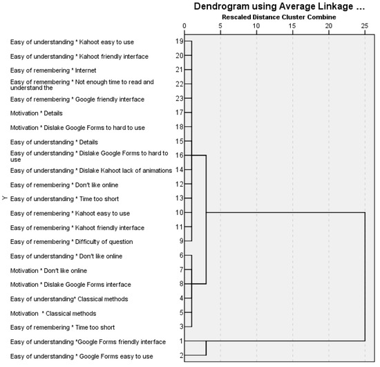 We also find associations with Google Forms-friendly interface and use of the internet for ease of remembering. Since the success of an e-learning system depends on students’ willingness and acceptance to use this system [46,48,49], it explains the high number of chi-square associations. Ease of understanding also registers significant correlations with pedagogical and technological factors. The pedagogical predictors are classical methods, details, time too short, and the technological predictors are Google Forms and Kahoot easy to use, Kahoot-friendly interface, etc. Learning motivation is one of the most studied variables [50], a force which gives direction to continue and choose a particular learning behaviour [51], and from this point of view is very important in the educational process. In our case, the students’ motivation is influenced by Kahoot due to the interface design and ease of use. We find as a constant the variables time too short (a frequency of 47.36%) and details (a frequency of 5.26%), these being the only problems that could demotivate some of the students. The variable relaxation is associated with Kahoot and one social factor, I am not bored/it is fun.
