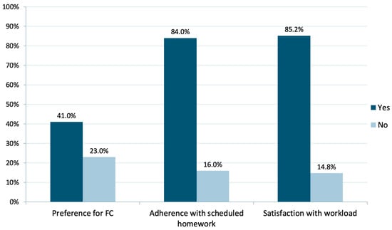 Students positively valued the FC method, with 41% preferring FC over other methods, 23% preferring traditional class, and the remaining 36% not showing any preference (Figure 1). Specifically, students’ satisfaction with FC was high in all the measured aspects: in terms of enthusiasm (4.6/5 ± 0.7), the utility of the video lectures (4.6 ± 0.6), students’ participation (4.4/5 ± 0.7), course organization (4.2/5 ± 0.6), and workload (4.1 ± 0.6).