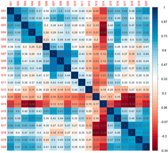 Prior to the CFA, the correlation matrix was calculated. As the survey is made of ordinal categorical variables from 1 to 5, polychoric correlations are the most correct to measure correlation [39]. Figure 2 shows the correlation matrix, where it can be seen that all the variables (items or questions) have a positive correlation, except questions Q13 and Q14, shown as dark in the figure due to negative correlations. These two questions do not have the same consistency as the rest of the items, thus, they should be removed from the set of questions. This is because they are prone to create discrepancies in the survey. This can be consequence of a conflict of interest of students in deciding whether or not friendship with the colleague influences the evaluation.