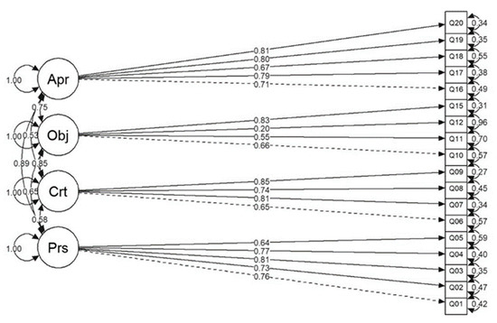 On the other hand, Figure 3 shows the model proposed in the CFA. The four dimensions (also called latent variables) are represented by circles: Personal evaluation (Prs), Criteria (Crt), Objectivity of evaluation (Obj) and Learning from the experience (Apr). The squares stand for each question (item or observed variable) in the survey. The arrows that join latent and observed variables are the weights of the multivariate model (generally called “estimates” in statistical software). The bidirectional arrows on the circular elements (dimensions) indicate the covariances among the said dimensions. The bidirectional arrows on the square elements (observed variables) indicate the variances of the residuals.