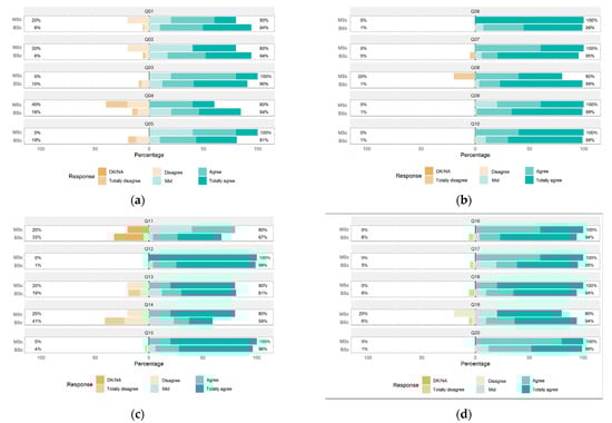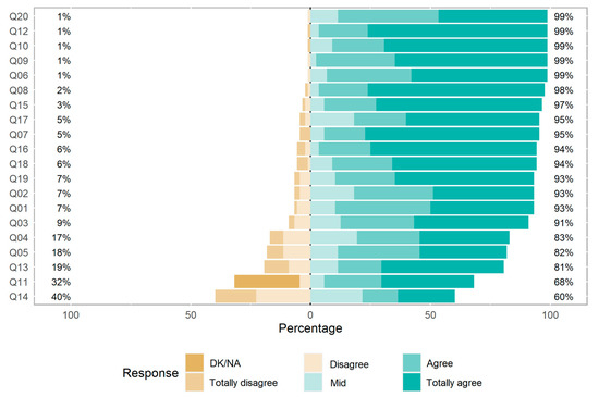 First, the distribution of the responses according to the Likert scale was analyzed. Figure 4 shows the distribution of the responses ordered in scale decreasing order. As stated before, question Q11 is the only one that has DK/NA, just as it was collected in the original survey (recalling that, in the CFA, the mean of the distribution was imputed to these DK/NA values, so that the statistical distribution is not perturbed).