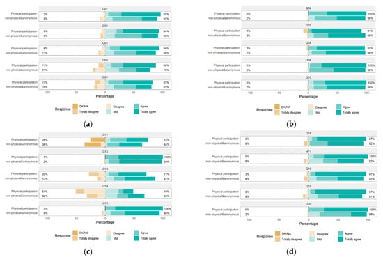 Distribution of the responses to the 360-degree evaluation, classified according to attendance and anonymity. The responses are grouped by: (a) from Q01 to Q05, (b) from Q06 to Q10, (c) from Q11 to Q15, and (d) from Q16 to Q20.