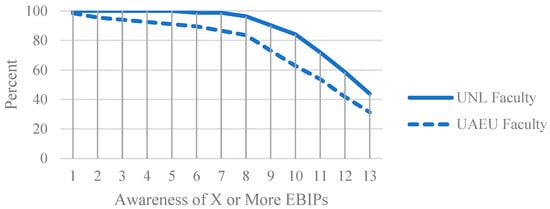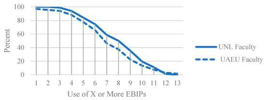 Next, the authors considered only the awareness and adoption levels of the 13 EBIPs (excludes the first three teaching practices). On average, UAEU faculty are aware of 9.9 EBIPs and adopt 6.5 EBIPs, as compared to 11.4 and 7.3 for UNL faculty, respectively. Figure 1 below provides the percentages of both UAEU and UNL faculty who are aware of X or more EBIPs. Nearly every participating UNL faculty member (99%) professed awareness of at least 7 EBIPs, compared to only 87% of participating UAEU faculty for the same. The lines most diverge at awareness of at least 10 EBIPs, with 84% of UNL faculty professing awareness versus 63% of UAEU faculty. Furthermore, 44% of UNL faculty are aware of all 13 EBIPs, as compared to 31% of UAEU faculty. Figure 2 below provides percentages of both UAEU and UNL faculty who utilize X or more EBIPs, showing similar percentages between the faculty groups. The lines most diverge at 7, 8, and 9 EBIPs, with UNL faculty professing 12–13% higher usage for each compared to UAEU faculty. However, the lines merge again at 12 and 13 EBIPs.