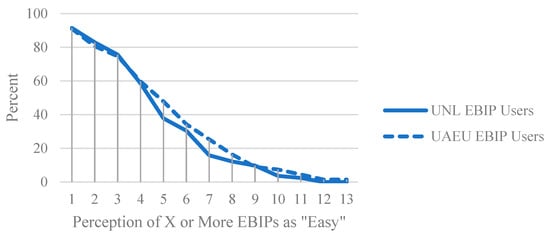 Next, the authors considered only faculty-perceived ease-of-implementation levels for the 13 EBIPs. Given that only faculty who professed to utilize an EBIP were directed to the ease-of-implementation survey question, only the perceived ease-of-implementation responses of the EBIPs that faculty professed to use are considered. On average, out of the EBIPs that both UAEU and UNL faculty professed to use, both groups of faculty perceive a similar number of EBIPs as being “easy”, 4.5 and 4.2, respectively. Figure 3 below provides the percentages of both UAEU and UNL faculty users of EBIPs who perceive X or more EBIPs as “easy”. Both faculty groups profess very similar views in terms of how many EBIPs they utilize are “easy”. Furthermore, both 91% of UAEU and UNL faculty users of EBIPs perceive at least 1 EBIP as “easy”, along with only 1% and 0% perceiving all 13 EBIPs as “easy”, respectively.