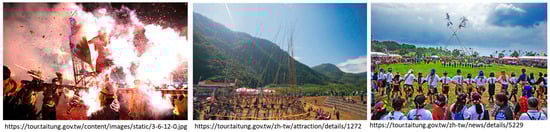 Taitung County has one city, two towns, and 13 townships. Because of its late development, Taitung retains a rich aboriginal culture. According to the statistical report of the Taiwan Council of Indigenous Peoples Taitung’s indigenous population accounts for more than 30% of Taitung’s population, the highest in Taiwan. From the highest to the lowest indigenous population, the order is the Amis, Puyuma, Paiwan, Bunun, Rukai, and Atayal. In terms of tangible assets, aboriginal cultural relics and crafts of each ethnic group are quite diverse and rich. For example, the Puyuma are good at weaving rattan or bamboo utensils, using such techniques as square weaving, herringbone weaving, and hexagonal weaving to weave rattan baskets, rattan bags, and backpacks; the Paiwan have earthenware pots, glazed beads, bronze swords (three treasures of them), as well as cups and earthenware beads; their antiquities include human-animal-shaped jade penannulars and frog-shaped jade ornaments of the Hualgang Mount culture, whose totemic motifs all have deep cultural connotations of the aboriginal people. In terms of landscape and ecology, Taitung is bordered by the Pacific Ocean to the east, located in a tropical climate zone and facing the mountains near the sea, with a coastline of 176 km, the longest in Taiwan []. Taitung is also home to many animals, including wild boars, Reeves’s muntjac, Rusa unicolors, and Pteromys volans in forests; Taitung also has many famous marine animals such as the dolphinfish brought by the tide, marlins in Chenggong Township, and Cypselurus in Pongso no Tao. In terms of architectural resources, Taitung has 47 featured buildings, such as Chinese Consolidated Benevolent Association, Taitung Thean Hou Temple, Baoting Art and Culture Center, Guanshan Station Kanzan, GoBen Farm, YiWan Taiwan Presbyterian Church, Lyudao Lighthouse, Lanyu Weather Station, and the chapel of St. Joseph Technical High School. In addition, the only Taitung architect in Taiwan e-Learning and Digital Archives Program of National Science and Technology Council—Mr. A-Yu Lu, whose architectural works, such as Taitung County Council, the Old Beinan Township Office, the Baosang Road Building, the Cave House (the old office building of Taitung County Tax Bureau), and San Hai Department Store, (shown in Figure 1) though an amateur, occupy an important place in Taitung’s architectural history with his distinctive architectural style. In terms of intangible assets, Taitung’s most well-known folklore belief of Bombing Lord Handan in the Lantern Festival enjoys equal popularity as Yanshui Beehive Fireworks Festival and Pingxi Lantern Festival for being the three major Lantern Festival folklore events in Taiwan. The indigenous people’s festivals include the Paiwan Five Year Ceremony, Puyuma Mangayaw (Indigenous Hunting Festival), Tao Flying Fish Festival and Boat Launching Festival, and Bunun Ear Festival (Wikipedia: Taitung County Government, Taitung County cultural assets, Taiwan’s Indigenous Peoples Portal, and Taitung County of Indigenous People website). The relevant indigenous people’s festivals are shown in Figure 2.
