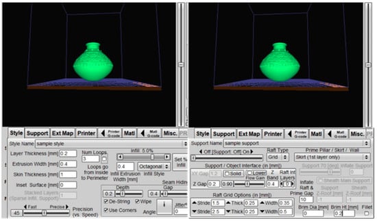 From past 3D printing experiences, it can be learnt that not all 3D digital models can be printed smoothly, and this is the main reason why ordinary users have difficulties in 3D printing. For example, 3D models that are nearly 90 degrees or in the air may not always be able to be printed smoothly and must first be analyzed by slicing software to calculate the external support structure and help convert the 3D file into a slicing file, and then adjust the relevant parameters. This is to prevent the model from collapsing and failing when the user prints. Therefore, in this study, considering the ease of printing and convenience, each model was successfully printed and tested before uploading to the platform, and the values of the slicing parameters at the time of successful printing were also fully recorded to improve users’ printing success rate, taking the Yin-Yang pottery pot as an example, as shown in Figure 3.