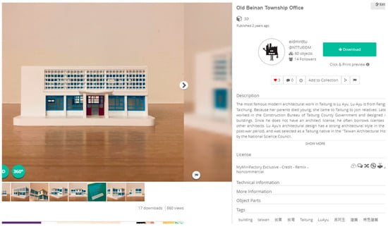 A total of 60 digital models of Taitung culture were completed in this study, and the exhibits were presented on the platform as Figure 4. All of the works have been uploaded to the world’s two most well-known and most-used open-source platforms, Myminifactory [https://www.myminifactory.com; (accessed on 20 January 2022)] and Thingiverse [https://www.thingiverse.com; (accessed on 20 January 2022)], and an account has been set in the Taitung Culture Content Zone for future file management, updating, and analysis.