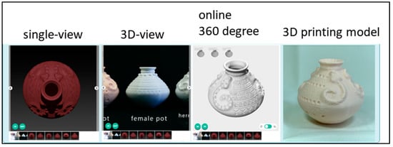In response to the rise of digital tools and open-source sharing and co-creation, digital manufacturing and open-source sharing have become new trends in the industry in recent years. Cultural content and objects should keep pace with the times and become closer to people’s lives. Nowadays, digital manufacturing tools have become digitalized, affordable and popular. Open-source databases of 3D models for free downloading and printing are flourishing, and it is increasingly common for users to download what they print. The world’s first 3D model open-source database, Thingiverse, emerged in 2008. In Taiwan, the first 3D model search platform, Yobi3D, was established by a non-governmental organization in 2014, and in the following year, the Industrial Development Bureau of the Ministry of Economic Affairs also established an official 3D model platform, Fast Lab. To date, there are dozens of common 3D model open-source platforms domestically and internationally. However, the content of the platforms is only about dolls, mechanical parts, and household items. The applications of 3D printing worldwide are primarily on consumer products (29%), automobiles (19%), medical care (13%), education (10%), space (8%), and industrial machinery (7%). Moreover, 3D printing technology has been used in various fields, such as society, technology, education, and medicine, with varied performances. Tseng and Wang (2019) applied 3D printing to prosthetic limbs through teamwork and open-source design, making the process faster and more relevant to users []. With the emergence of 3D printers that can print circuit boards or food, the content subject to 3D printing has been much more than ever before, but the cultural content is rarely a digital print target.