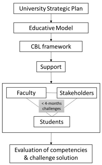 Tecnologico de Monterrey is a private university located in northern Mexico. It is the number 1 private university in Mexico and 30 worldwide, following the QS ranking. To face the challenges and opportunities glimpsed in the 21st century, Tecnologico de Monterrey developed and implemented a new educational model: Tec21, starting in 2012 and fully implemented in 2019 [18]. As an Institutional objective, this model was under the premise of strengthening academic quality. CBL is one of the Tec21 Educational Model pillars, following: Flexibility (it consists of offering the students different alternatives to plan their development in congruence with the strengthening of personal identity); Inspiring trained faculty (characteristics of the professors that allow them to leave their mark and be an aspirational example to the people with whom they interact inside and outside the institution); and a Comprehensive educational experience that makes it memorable (induction of affinity relationships that favor personal and professional identity through experience) [18,19]. CBL pedagogical orientation with which challenges are implemented in block-type training units is part of the operation or execution of the educational model, which includes the dimensions of the challenge, student, environment, and faculty, which interact for learning.