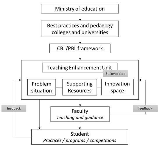 - Reymen, I.; Bruns, M.; Lazendic-Galloway, J.; Helker, K.; Cardona, A.V.; Vermunt, J.D. Creating a Learning Ecosystem for Developing, Sustaining, and Disseminating CBL the Case of TU/e Innovation Space. In The Emerald Handbook of Challenge Based Learning; Vilalta-Perdomo, E., Membrillo-Hernández, J., Michel-Villarreal, R., Lakshmi, G., Martínez-Acosta, M., Eds.; Emerald Publishing Limited: Bingley, UK, 2022; pp. 13–33. ISBN 978-1-80117-491-6. [Google Scholar]