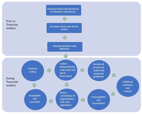 The codes derive from a priori and emergent themes. A priori reflects what the researcher expects to encounter from the research questions and the emergent themes are codes that emerge after the data collection. There were two rounds following the coding process diagram to achieve the final codebook, which is published with the results/quotes [32]. In addition, the principal investigator noted the ideas in the field journal, recording any topics that the research has not adequately addressed up to the present and ones that emerged unexpectedly in the transcripts, allowing the audition of the trail.