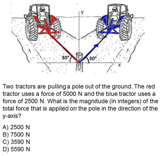 In Figure 2, an example of an integrated physics and mathematics item can be found. This item is situated in the domain of mechanics, a context that is familiar to students, since it has been regularly addressed in classroom problems throughout the ongoing school year. To solve the problem, students should determine the resulting force on the tractor, taking into account the nature of forces. They therefore have to apply mathematical ideas concerning vector addition. As illustrated by this solving strategy, students need to combine concepts from both physics and mathematics in an effective manner, hence giving evidence of integrating ability.