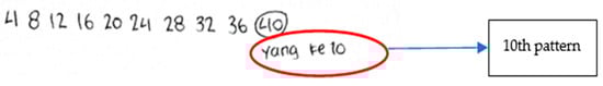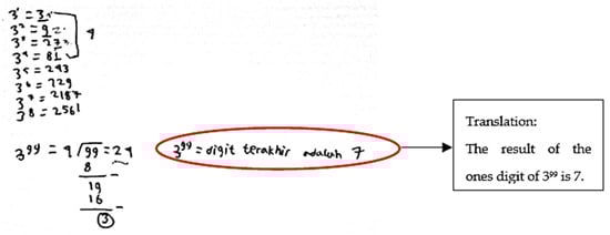 When working on Question 2, SS wrote down the resulting pattern of the number raised to the power of 3 and circled every last digit. From the circled unit numbers, the sequences 3, 9, 7, and 1 were obtained repeatedly. SS provides a dividing line between the numbers 34 and 35. SS does this to show the repeating pattern of the number’s last digit obtained from the power of three (Figure 10). However, during the interview, SS could not explain the relationship between the remainder 3 and the conclusion that the unit digit of 399 is 7. SS stated, “I am still confused after finding the remainder 3 with the last digit of the 399”. SS can already utilize known information but is not yet able to choose a set of rules that can be used to construct and test conjectures.