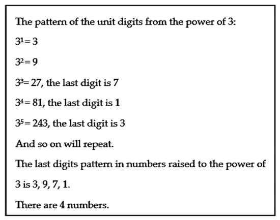 Metacognitive control in writing is observed from the answers given by IS. For example, in his answer to Question 2 (Figure 4), IS only writes 31 = 3, 32 = 9, 33 = 27, and 34 = 81. Then, IS writes “and so on”, indicating that there will be a pattern repetition. IS also writes that the unit digit that always repeats is four numbers (Figure 4). However, after that, IS still needs to complete the answer. These answers show that IS was not writing when compiling or assembling intermediate targets (rules used) from the information given in the questions.
