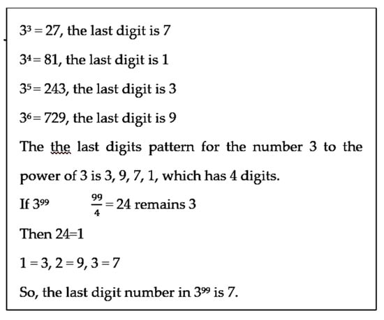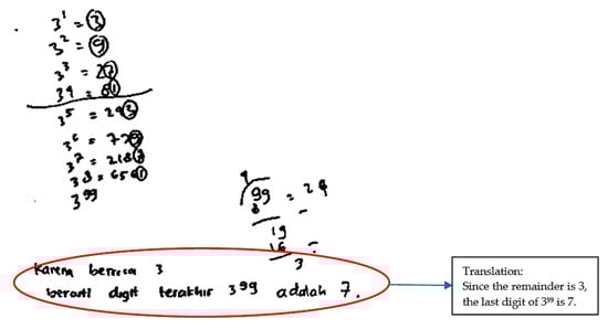 Furthermore, compiling and testing conjectures is the second indicator of the cognitive aspects of students’ mathematical reasoning behavior. When working on Question 2, AS observes the final digit of the power of three, forming a pattern of 3, 9, 7, and 1 sequentially. The pattern changes are four numbers that constantly change repeatedly. AS divides 99 by 4 and sees four repeated digit changes. In the end, AS found that the ones place digit of 399 is 7 (Figure 7).