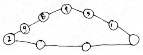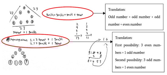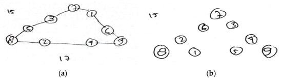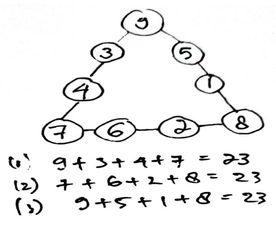 Based on SS’s answer (Figure 11), it can be seen that SS initially entered the numbers in the small circles on each side of the triangle. SS places the numbers 2, 9, 8, and 4 in the small circles on the line on the left side of the triangle. The sum of the four numbers is 23. However, on the right side of the triangle, SS fills the small circles with the numbers 5 and 1. SS adds up the numbers (4, 5, and 1) on that side, and the sum is 10. Next, SS needs the number 13 in the empty circle on the right side of the triangle to make the sum of all four numbers equal to 23. However, the number 13 is not a number that can be used to fill the small circles on the side of the triangle. In the end, SS did not fill the circle at the triangle’s base with numbers.