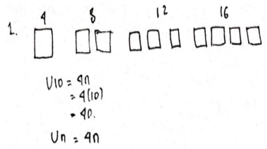Based on the answers to Question 1, SS can already utilize the information provided, choose several sets of rules, and arrive at logical conclusions. This condition is shown by SS’s answer to the first problem, as shown in Figure 9. SS creates an image representation of the configuration of square objects and square combinations, then immediately writes down the number of matchsticks needed for each image. SS also immediately writes u10 = 4n by relying on information from the number patterns 4, 8, 12, 16, and so on. Next, SS writes u10 = 40. SS can write down the rules for finding the nth pattern, un = 4n.