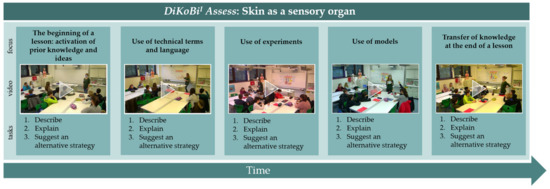 One example of a video-based simulated learning environment is the learning environment DiKoBi (Diagnostic Competences of Biology teachers in Biology classrooms). DiKoBi, which was developed by Kramer et al. [16] as a video-based simulated learning environment for pre-service biology teachers (DiKoBiLearn) and as an assessment tool for their reflection skills in classroom situations (DiKoBiAssess). The learning environment consists of three consecutively recorded lessons (DiKoBiI, DiKoBiII, and DiKoBiIII) on the topic “skin”, and the teacher is teaching a fifth-grade class [16]. Each of the three lessons is divided into five videotaped classroom situations. Every classroom situation focuses on another aspect of biology-specific instructional quality: (1) the beginning of a lesson and the activation of prior knowledge and ideas, (2) the use of technical terms and language, (3) the use of experiments, (4) the use of models, and (5) the transfer of knowledge at the end of a lesson [16]. Pre-service teachers are asked to complete three tasks for every classroom situation: (1) describe, (2) explain, and (3) suggest an alternative strategy (see Figure 2). These tasks were developed based on the concept of professional vision [26].