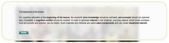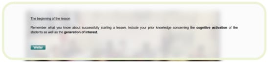 A former study showed that the implementation of PCK-scaffolds can significantly improve the diagnostic competencies of pre-service biology teachers assessed in the learning environment DiKoBi [17]. To support the pre-service teachers in completing tasks in the learning environment, two different types of PCK-scaffolds were developed: cPCK-scaffolds and pPCK-scaffolds. The cPCK-scaffolds contain general information about the aspect of instructional quality in question in a classroom situation. They are not tailored to a specific classroom situation; however, they contain all the necessary information to correctly complete the tasks. An example is shown in Figure 3 for the first classroom situation (the beginning of a lesson and activation of prior knowledge and ideas). All cPCK-scaffolds were developed based on published findings and theories relevant to the aspect of instructional quality in each situation.