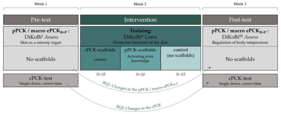 Data collection took place in February and June of 2021, meaning that all data were collected during the COVID-19 pandemic, and pre-service teachers were taking part in the study from home. Participation was voluntary but embedded in a university course that the students were taking part in. They worked on the study individually during all measurement periods. The study was conducted using a pre–post-test design (see Figure 5). In the pre-test, all pre-service teachers completed the cPCK-test as well as DiKoBiIAssess. In the intervention, pre-service teachers were randomly assigned to three groups. The pPCK-group completed DiKoBiIILearn, with pPCK-scaffolds included. The cPCK-group completed DiKoBiIILearn with cPCK-scaffolds included, and the third group completed the learning environment without any scaffolds included (control group). Due to the small sample size, we used a slightly smaller control group in favor of the treatment groups. In the post-test, all pre-service teachers completed DiKoBiIIIAssess without scaffolds included and the cPCK-test.