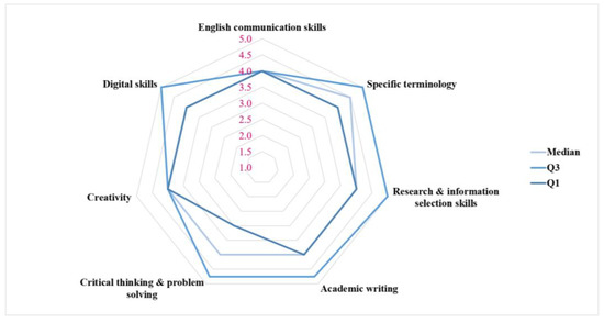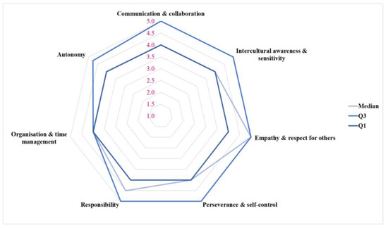 Figure 4, 75% of students assessed every item with 4 points or above. In terms of social and emotional skills, every item scored 5.0, except for autonomy and organization and time management, which scored 4.8 and 4.0, respectively. Regarding cognitive/functional skills, 75% of students assessed the development of specific terminology, research and information selection skills, and digital skills with 5.0; whereas research and information selection skills and critical thinking and problem solving scored 4.8, English communication skills and creativity scored 4.0. Critical thinking and problem solving, which received a mean score of 3.9 and was therefore considered the less developed competence, received a score of 3.0 from only 25% of students (Q1), which means that for the majority of the group this activity contributed significantly to the development of this particular competence as well.