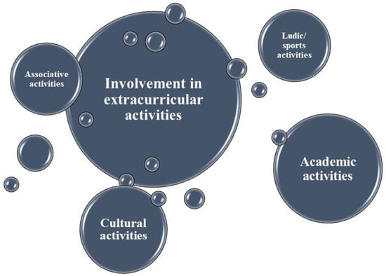 Based on Astin’s Theory of Student Involvement [12,24], Berger and Milem [36] argue that the more involved students are in the life of the HEI, the more likely they are to interact with and be affected by the environment of the campus. Moreover, the campus organizational environment and students’ perceptions of that environment directly influence the extent and types of student involvement [36]. This involvement is not limited, naturally, to students’ participation in academic activities but far exceeds these limits and is materialized, to a large extent, in their involvement in extracurricular activities of a more social or recreational nature [37].