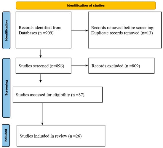 The process of inclusion of the studies involved the following steps: (1) The total number of studies obtained in the search was 909 studies, then 13 studies were removed because they were duplicates. (2) The titles and abstracts of the remaining 896 studies were checked to ensure that they were related to the topic under investigation. This step led to excluding 809 studies because they were not directly related to the topic. (3). The criteria of inclusion mentioned above were applied on the remaining 87 studies. In total, 26 studies were found to be eligible for inclusion in the analysis. The process of identifying relevant studies included in the meta-analysis is presented in Figure 1.