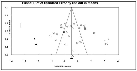 We employed the trim-and-fill procedure developed by Duval and Tweedie to assess the effect of publication bias on the overall effect size []. The trim-and-fill method removes the most extreme small-effect studies from the positive side of the funnel plot using an iterative process. With each iteration, the effect size was recalculated until the funnel plot became symmetrical under the new effect size []. Based on the outcomes of this method, we found two studies to be outliers on the negative side (i.e., [,]) which were removed from the publication bias calculations. As presented in Figure 2, the overall effect size decreased slightly. These studies were added when calculating the effect sizes because the change was slight and not significant.