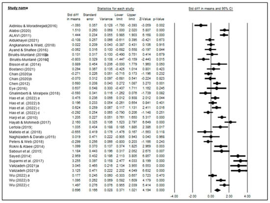 Forest plot of overall effect size of the impact of subtitles on L2 [,,,,,,,,,,,,,,,,,,,,,,,,,].