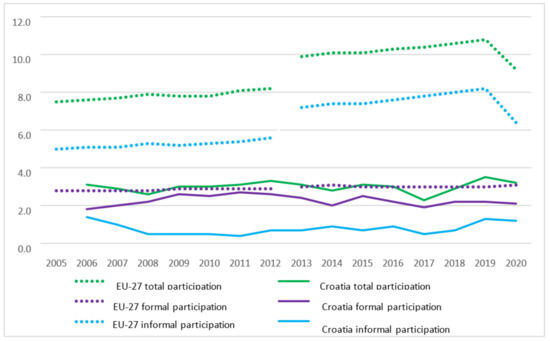 Participation of adults (25–64) in life-long learning by type of program, Croatian and EU-27 average. Source: LFS-Eurostat (https://ec.europa.eu/eurostat/databrowser/view/TRNG_LFSE_02/default/table?lang=en&category=sks.sks_dev.sks_devlf.trng_lfs_4w0, accessed on 8 December 2022). Consolidated by Matković and Jaklin [39]. Note: The lines are not connected in the years where a break in the series is indicated. Reprinted with permission of authors and journal editors from [39]. Copyright 2023, Hrvatsko andragoško društvo.