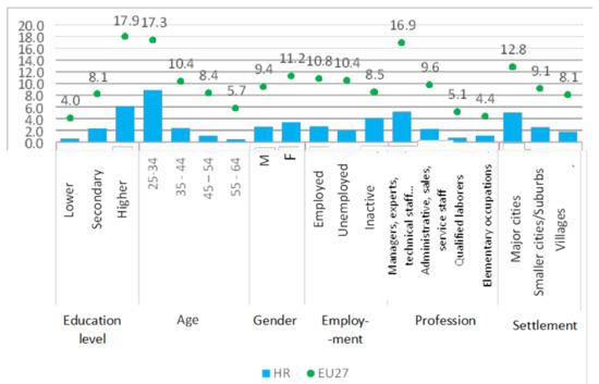 Age differences are more pronounced. As the age of the participants increases, their participation rate decreases. The younger groups are much closer to the European average than the older ones. The participation of young people is almost eight times higher than the participation of older people. The above can be explained to some extent by the methodology of the Labor Force Survey in Croatia, which includes participation in formal tertiary education after the age of 25, which is relatively high for the youngest age group in Croatia and is found due to the duration of studies. This bias of the Labor Force Survey can explain the larger differences compared to the EU average [39]. Participation in adult education is also strongly determined by the level of education. The highly educated are involved in additional adult education much more often than the less educated.