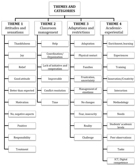 Content analysis using ATLAS.ti software allowed the identification of 36 categories and 4 main themes emerging from the data. As noted above, minimal changes in the phrasing of the questions in both questionnaires facilitated the clustering of similar responses under the same themes and categories despite small nuances. This is why Figure 1 below only shows a single list of said themes and categories not separated by group. Some categories may seem similar because of how they are named (e.g., “better than expected” and “positive”), but they differ on the type of content allocated for each category (e.g., “better than expected” refers to content related to the expectations of student teachers and mentors in contrast to the reality they found, while the category “positive” refers to the pleasant or enjoyable feelings they had during the analyzed period). With all this in mind, the four main themes emerging from the data were: