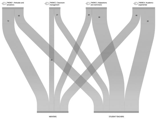 Figure 2 shows the interlocking nature of mentors’ and student teachers’ responses to the questionnaires, as well as the establishment of co-occurrent relationships among the themes emerging from the data. As can be seen, the number of student teachers’ responses significantly surpassed that of mentors in the adaptations and restrictions and academic–experiential realms. Mentors’ numbers, however, were larger when alluding to attitudes and sensations.