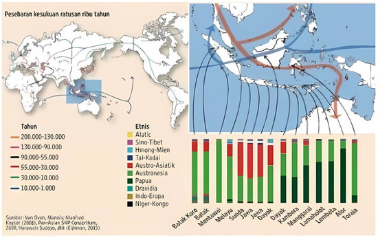 Indonesia is a multicultural country that has 1340 ethnic groups, 6 recognized religions, and 5 races, which sometimes provokes intolerance [12], evidenced by rampant acts of intolerance, especially after the fall of the New Order regime. Intolerance can be observed even more so in conflict-prone areas, along with opening channels of identity politics that carry the name of religion [13]. At least three sad incidents have been recorded due to society’s inability to promote tolerance for a diversity of identities. For example, the Islamic–Christian conflict in Ambon and Maluku, which caused the loss of hundreds of lives; the (Islamic–Christian) religious conflict in Poso, which resulted in the deaths of 577 residents, 384 injuries, and 7932 destroyed houses; and the Sampit–Madura conflict, which resulted in the killing of 315 residents [14]. Other acts of intolerance also occurred in conflict-prone areas, for example: the Cikeusik conflict in Banten and wars between villages and customary lands in Papua or West Nusa Tenggara. Trijono’s analysis states that this series of events started due to the incompatibility of implementing religious norms and cultural interests due to social change in a heterogeneous society [15]. Facing this phenomenon, tertiary institutions must provide a learning model of religious tolerance by using student learning patterns to achieve learning objectives. Figure 1 shows the Indonesian human genetic map.