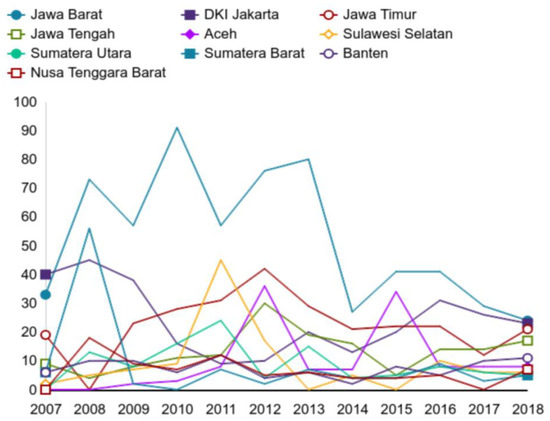 Meanwhile, the Setara Institute noted that from 2007 to 2018, there were 2400 violations of the Conditions of Freedom/Belief (KKB), with the most cases occurring in West Java, with most victims belonging to the Ahmadiyah congregation [19]. Figure 2 shows the level of religious tolerance in several provinces in Indonesia.
