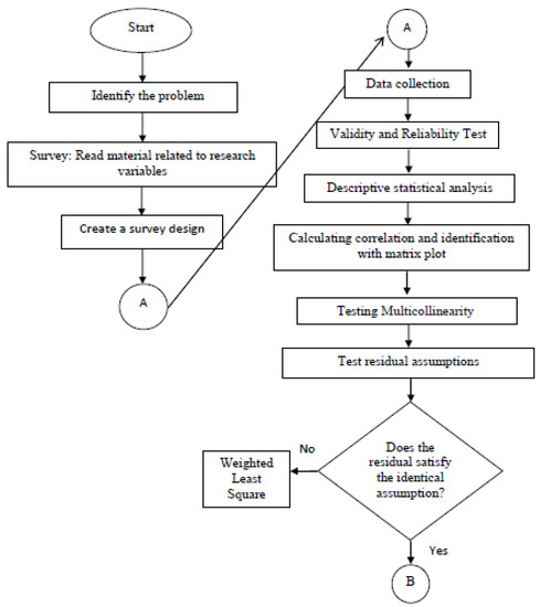 This research is quantitative, using multiple linear regression analysis methods. The stages in multiple linear regression analysis are: (1) testing the relationship between variables using a matrix plot and product-moment Pearson correlation test, (2) testing multicollinearity to see the relationship between predictor variables, (3) testing residual assumptions (identical, independent, and normal distribution), and (4) estimating the parameters and the significance of the parameters. Before conducting multiple linear regression analysis tests, it is necessary to test their validity and reliability first, because the data used in the study uses a Likert scale. In short, the research stages used can be seen in the following flow chart. Look at Figure 4 and Figure 5 to understand the procedure of this research.