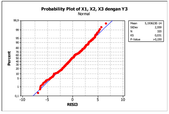 Next are the multiple linear regression analysis tests. The first step in this analysis is parameter estimation. The multiple linear regression model was obtained by estimating the parameters of the dependent variable Y3 with X1, X2, and X3: