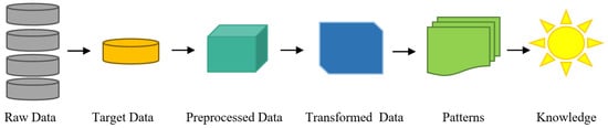 Data mining technology goes through several stages before reaching the results. The first stage begins with the collection of raw data from different data sources, followed by the data pre-processing stage such as denoising, excluding conflicting or redundant data, reducing dimensions, extracting features, etc. In the next stage, patterns are identified through several techniques, including grouping and classification. Finally, the results are presented in the last stage. Figure 1 shows a summary of the data mining process in general [9].