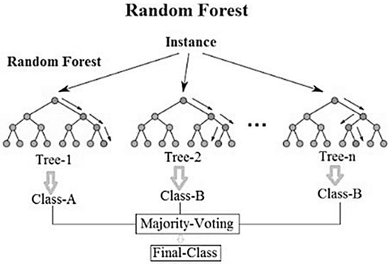 Random forests (RF) are one of the most effective and totally automated machine-learning techniques [26]. Suitable RFs were first presented in a paper by Leo Brieman [27]. RF is a method inspired by the decision tree (DT) [27]. It combines the idea of “bagging” with randomly chosen features [28] as shown in Figure 2. Additionally, it is based on Classification and Regression Trees (CARTs) sets to make predictions.