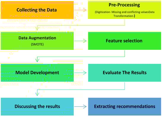 In this paper, machine learning technology relied on using WEKA (Waikato Environment for Knowledge Analysis), version 3.8.5 [38]. The WEKA Knowledge Analysis Project has been started in 1992 by the University of Waikato in New Zealand. It has been recognized as an outstanding open-source system in data mining and machine learning technologies [38]. WEKA also provides algorithms for regression, classification, and feature selection, as well as tools for data pre-processing and visualization [38]. The models for this study were built using RF, NB, and J48 algorithms. Moreover, Microsoft Excel was used in the step of pre-processing the data and extracting a statistical analysis for it. Both 10-fold cross-validation (CV) and direct partitioning (75:25) were completed to calculate the accuracy of each model. To evaluate the proposed model, multiple test measures resorted to accuracy, precision, recall, F-Measure, specificity, and ROC curve. Complete methodological steps are mentioned in Figure 4.