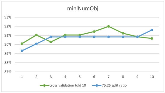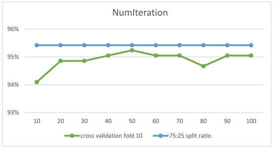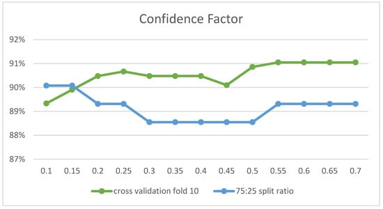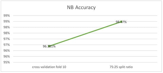 To compare the results of the two methods 10-fold cross-validation and 75:25 of the direct partition, the highest performance obtained by each algorithm has been recorded in Table 10. It is apparent that all the obtained accuracy ratios are close. Nevertheless, the highest performance was recorded using a 75:25 direct partition with the NB algorithm with a value of 99.34%, while the lowest performance was 96.72%. As for the 10-fold cross-validation method, it reached the highest performance with a value of 98.2% with RF. As for the lowest performance, it was 95.33% using the J48 model. In addition, the accuracy rate for all models was 97.02% for 10-fold cross-validation and 98.57% for 75:25 direct partition. Therefore, the average difference between the performance of the models for each method is 1.54% in favor of the 75:25 split ratio.