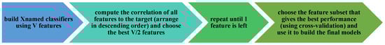 Feature selection or also known as (dimensionality reduction) is a process used to find the optimal set of attributes or features affecting a training set [41]. The selection of features is completed by excluding the features that are not relevant. This method helps to raise the prediction accuracy. There are many ways to determine the features, including the manual method or by using feature identification techniques. This paper focused on the application of feature identification technology based on correlation. This method is based on the identification of features based on the value of the correlation coefficient [42] between the attribute and the class. A good feature is the most relevant to the class attribute compared to the rest of the attributes. The feature determination was performed by applying the CorrelationAttributeEval function provided by the WEKA environment [43,44,45,46,47].