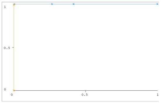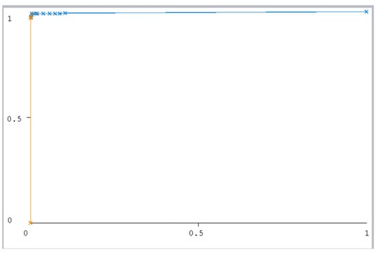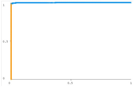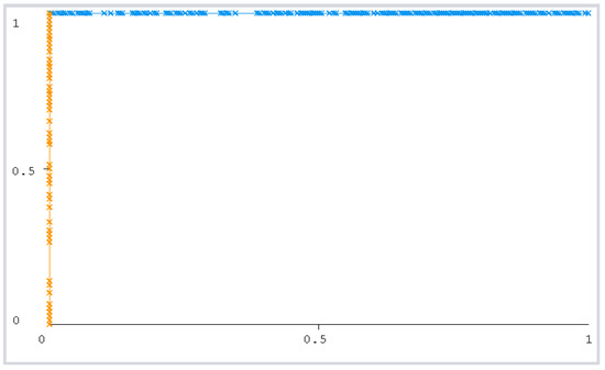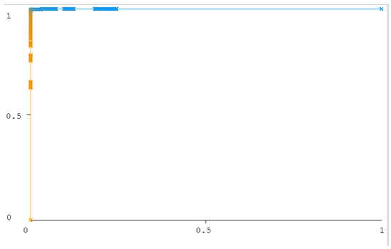 The ROC curve figure displays the performance of the classification models at all classification thresholds. The curve shows the model’s ability to categorize specific cases into target groups [49]. All classifier curves are listed in Figure 12, Figure 13, Figure 14, Figure 15, Figure 16 and Figure 17. All the curves shown are for Class A classification. The values of the rest of the curves of the categories (B, C, and D) are similar in each model. The ROC curve with classifiers RF and NB had a value of 1 which is the highest with a 75:25 split. In addition, the J48 model received a value of 0.99. These values are considered excellent to the extent that the models are considered reliable. The values of the curves are shown in Table 11.